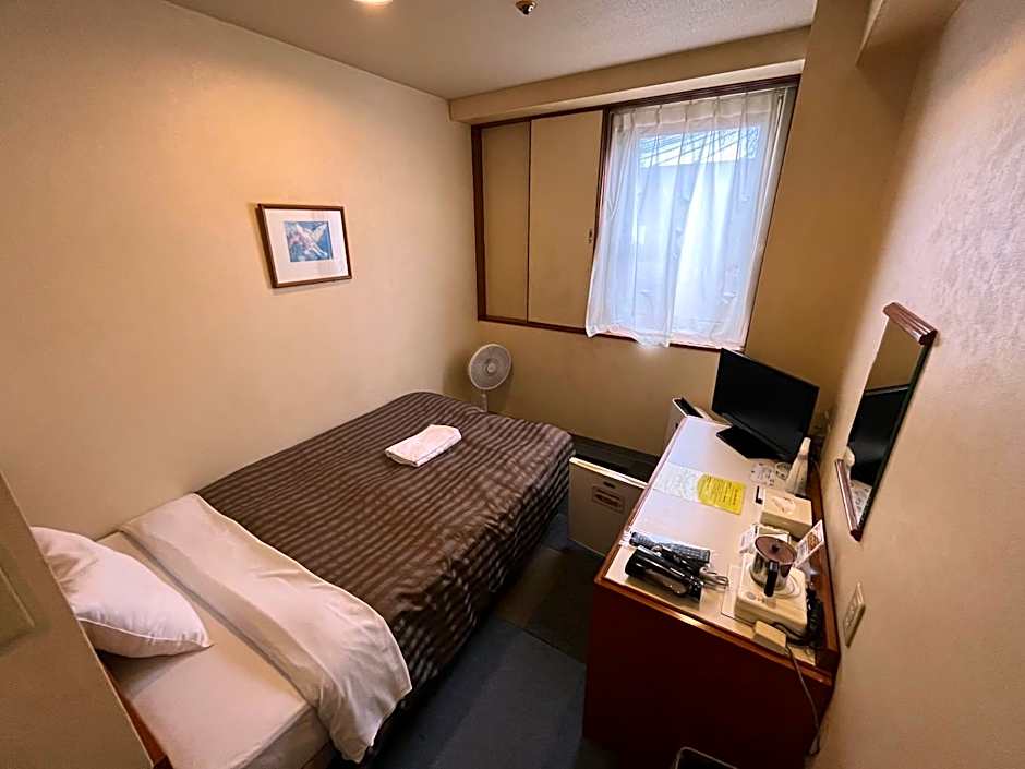 Features a semi-double bed (47 in wide). Room comes with an private bathroom, a fridge and an electric kettle with green tea bags. Japanese Yukata robes and toothbrush sets are provided for all guests. Room has no AC.